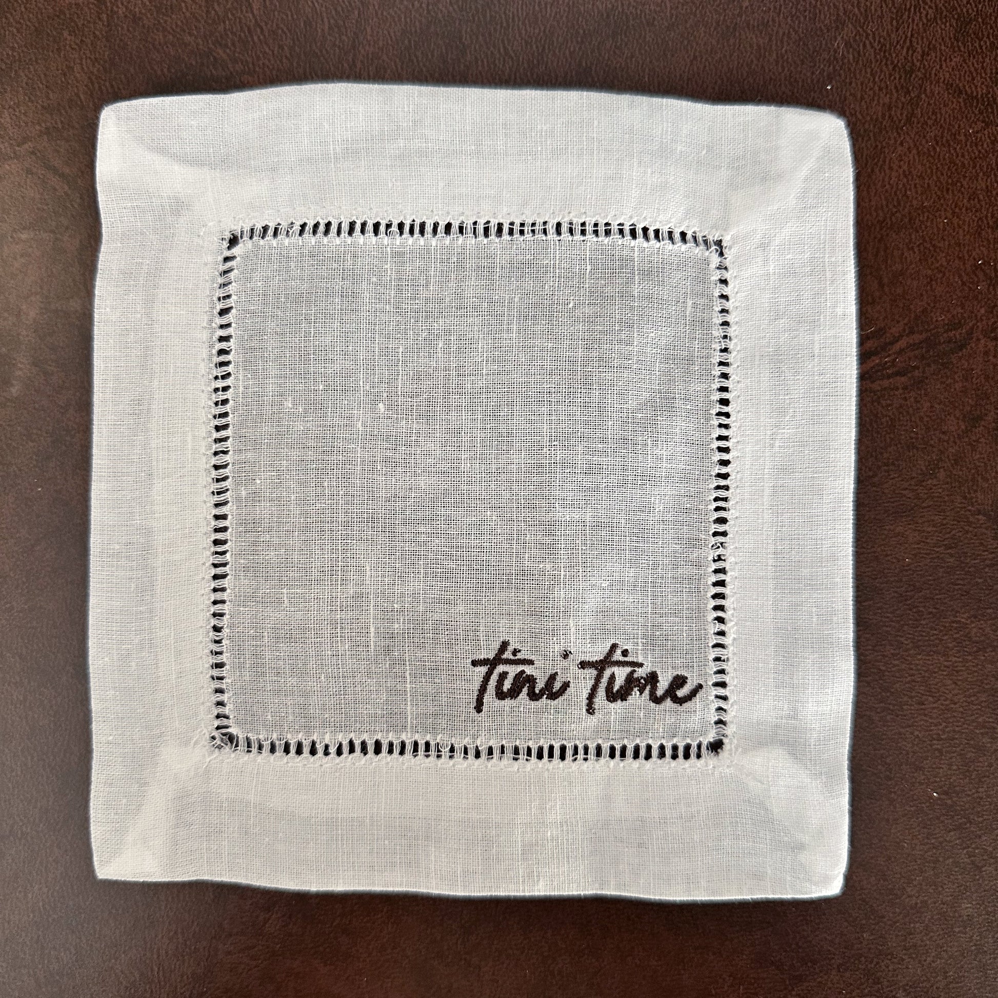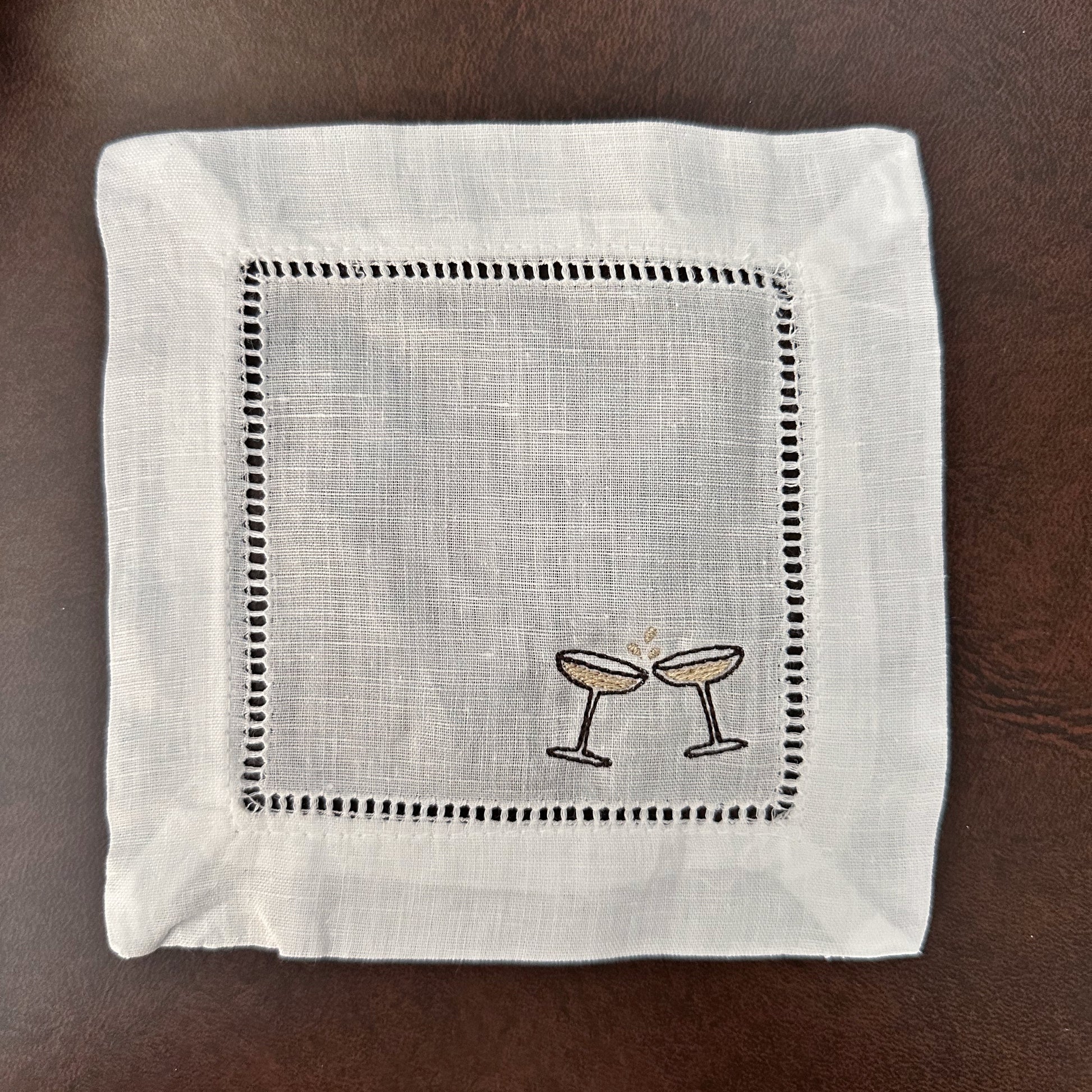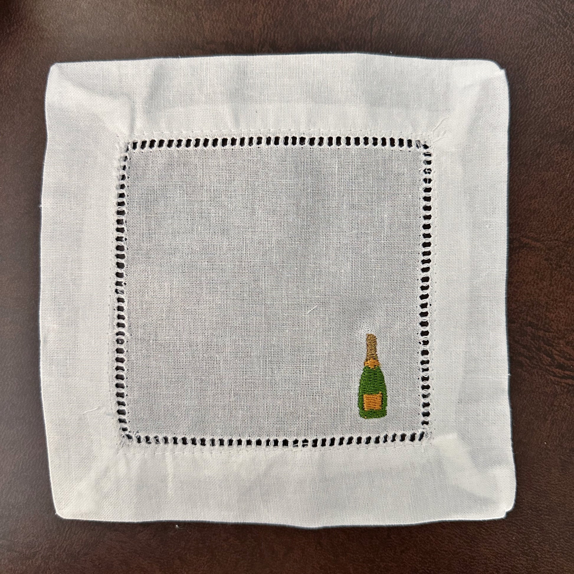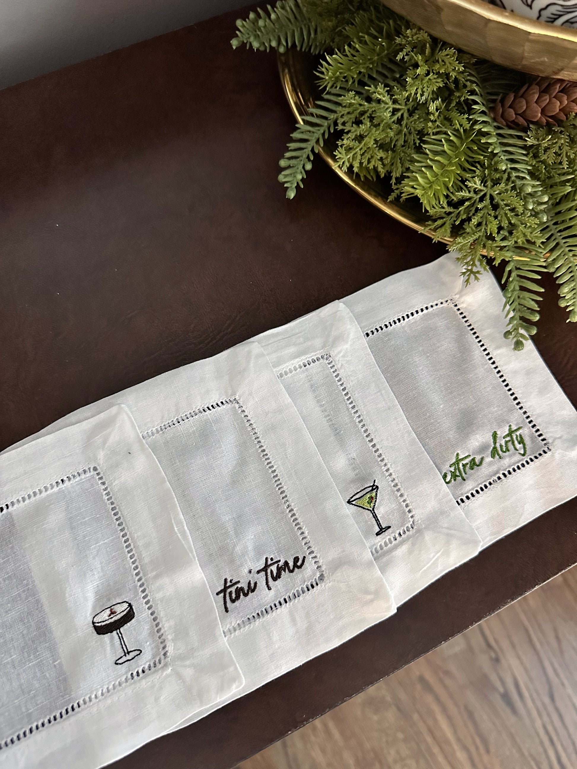 Beautiful set of four (4), six (6), or eight (8) linen hemstitched cocktail napkins with tasteful bar themed embroidery designs! Ditch the paper napkins and entertain in style!